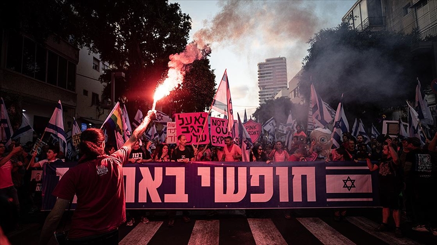 Netanyahu öncülüğündeki aşırı sağcı koalisyon hükümetinin yargı düzenlemesine karşı her hafta cumartesi akşamı kitlesel gösteriler düzenleyen İsrailliler, protestoların 20’nci haftasında ülke genelinde yine meydanlara indi.