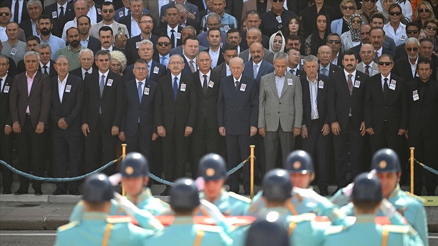 Törenin başında MHP Genel Başkanı Devlet Bahçeli, CHP Genel Başkanı Kemal Kılıçdaroğlu ve İYİ Parti Genel Başkanı Meral Akşener birbirleriyle tokalaştı.
