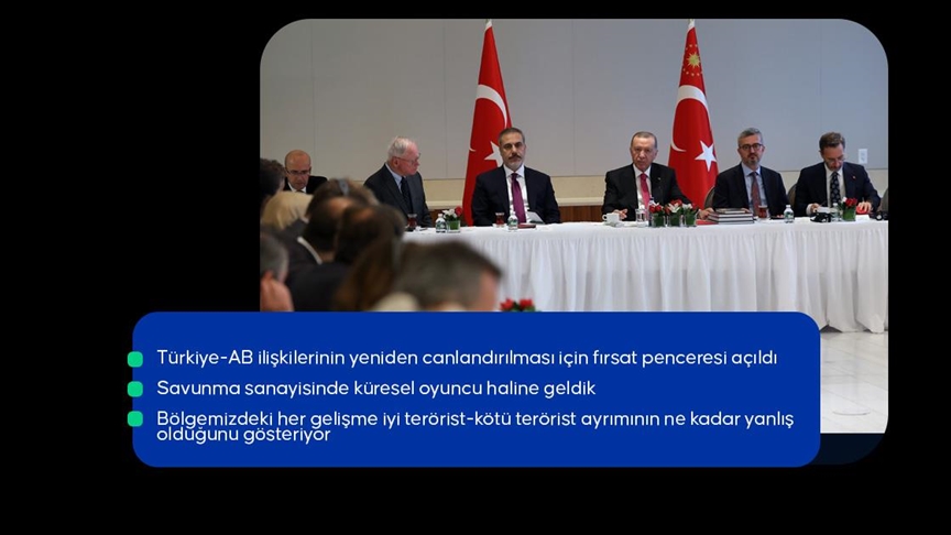 “Karşılıklı diyalogla ilk etapta çözümsüz görünen birçok meselenin üstesinden gelebileceğimize inanıyoruz. Körfez’den Batı dünyasına pek çok bölgeyle bunu başardık. Kazan-kazan anlayışı içinde ilişkilerimizde yeni bir sayfa açtık, çok kısa sürede çok büyük mesafeler aldık. Bunu ilerletmekte kararlıyız. İçinde bulunduğumuz kritik dönemde Türkiye-Avrupa Birliği (AB) ilişkilerinin yeniden canlandırılması için bir fırsat penceresi açıldığını görüyoruz. Türkiye’nin AB’ye katılım sürecinin canlandırılmasının önemini vurgulamaya devam ediyoruz. Şüphesiz tek başına bizim istememiz yeterli değildir. Bu gayretlerimizin hedefine ulaşmasında AB’nin tavrı da belirleyici olacaktır.”